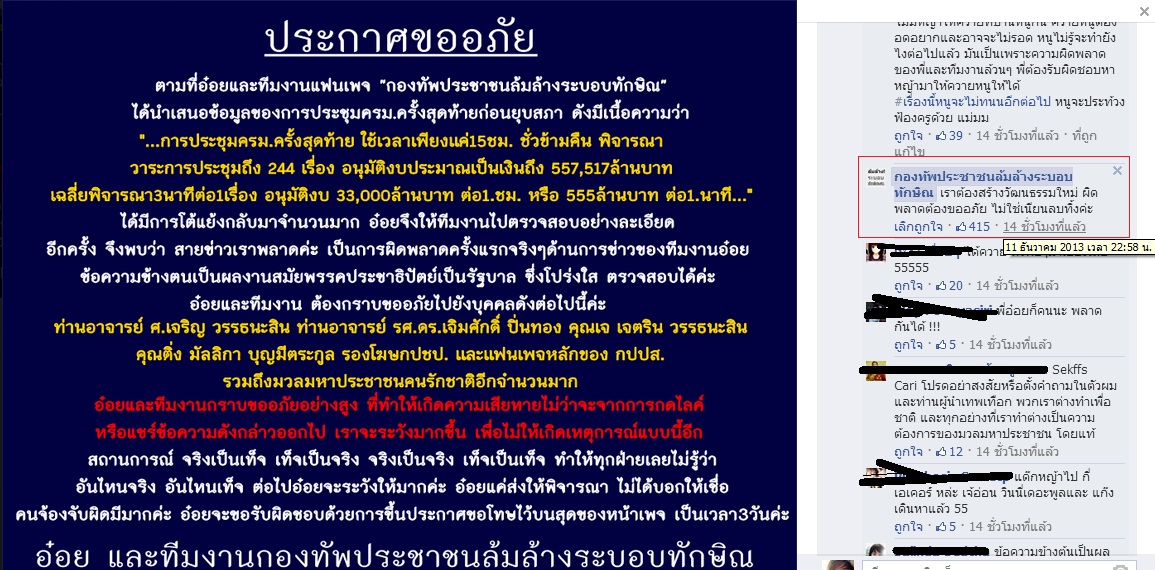 แถลงการของเพจ กองทัพประชาชนล้มล้างระบอบทักษินนะครับ