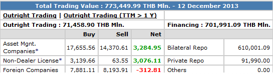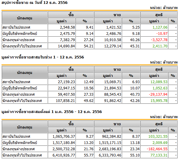 เว็บไซต์ตลาดหลักทรัพย์แห่งประเทศไทย รายงานสรุปการซื้อขายหลักทรัพย์ โดยแบ่ง ตามประเภทนักลงทุน ประจำวันที่ 4 มีนาคม 2557 ดังนี้ กลุ่ม ปริมาณซื้อ % ปริมาณขาย % สุทธิ (ลบ.) (ลบ.) (ลบ.) นักลงทุนสถาบัน 1,7