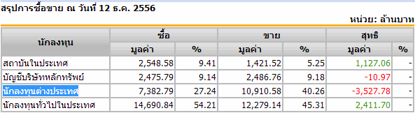 Sinthorn Summary 12/12/2556 : ต่างชาติขายสุทธิ -3,527.78 ลบ.