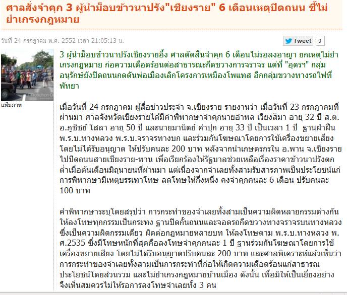 กรณีที่ ๑ ชาวนาไทยที่เชียงราย ปิดถนน ๓ วัน ศาลสั่งจำคุก ๖ เดือน ปรับ ๑๐๐ บาท ไม่รอลงอาญา เนื่องจากสร้างความเดือดร้อน ไม่ยำเกรงกฎหมาย