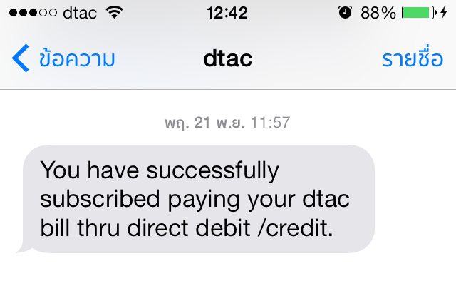 ผมใช้บริการ Dtac โดยรับใบแจ้งยอดบริการผ่านทาง e-mail และชำระผ่านบัตรเครดิตกสิกรมานาน โชคดีที่มี sms จาก Dtac แจ้งมาว่า มียอดค้างชำระของเดือน 7 พ่วงมาด้วยกับยอดของเดือน 8 ถึงได้งง และโทรสอบถามทาง Dtac