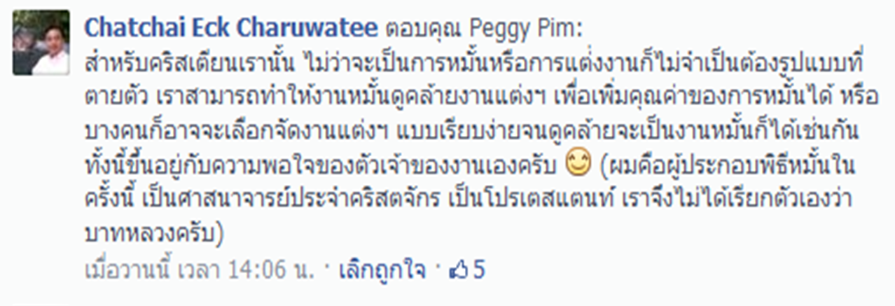ขออนุญาติ นำ Comment ของอาจารย์ที่ทำพิธีในงานหมั้นมาให้ทุกคนได้อ่านนะคะ จะได้เข้าใจพิธีในแบบ คริสเตียนค่ะ
