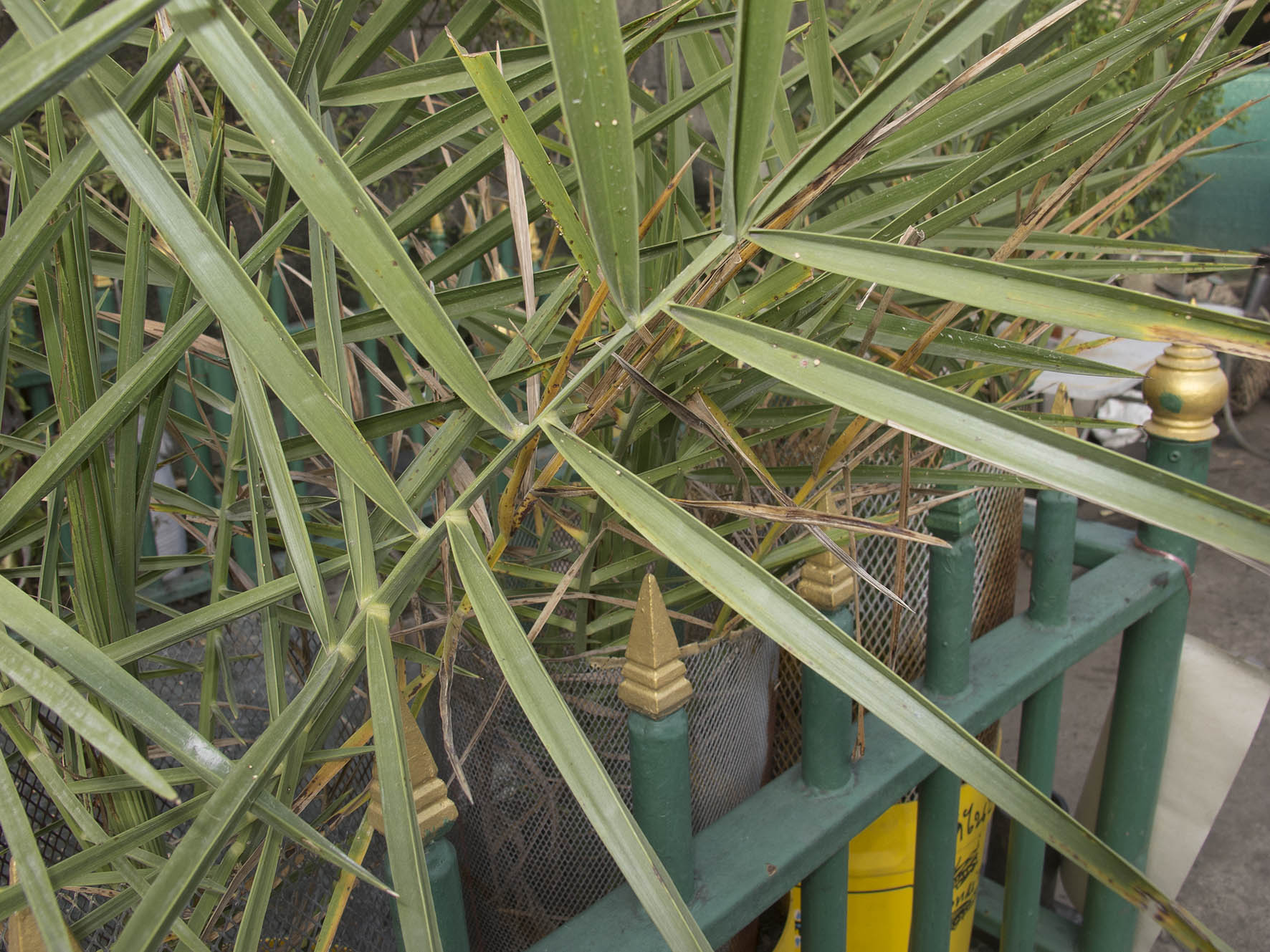ปลูกอินทผาลัมเพาะเมล็ดไว้ 3ต้น ในบริเวณบ้าน ปลูกไว้ในถังพลาสติกที่เคยใส่น้ำมันหล่อลื่น ขนาด 18 ลิตร ปีหนึ่งแล้ว