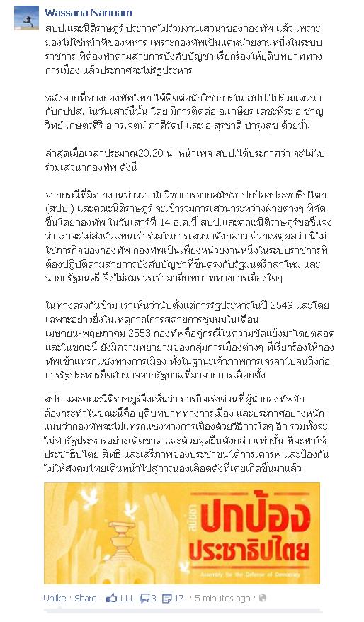 จาก https://www.facebook.com/photo.php?fbid=835631479783843&set=a.207809682566029.60836.173829542630710&type=1&theater ทหารจะออกมาทำไม ... ซึ่งทำให้ภาพลักษณ์ประเทศไทยเสียหมด ... มีทหารอ