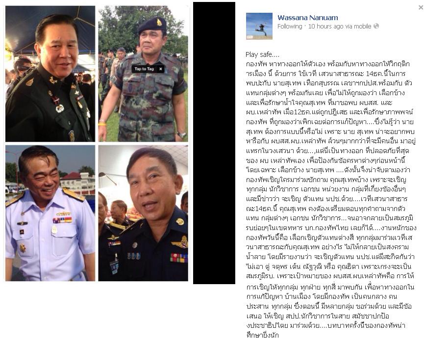 แต่พอทางกองทัพออกมาแถลงข่าว บอกว่าให้สุเทพไปชี้แจงกับองค์กร ส่วนต่างๆ โดยเปิดเป็นเวทีสาธารณะ ให้สุเทพชี้แจงและตอบข้อซักถาม