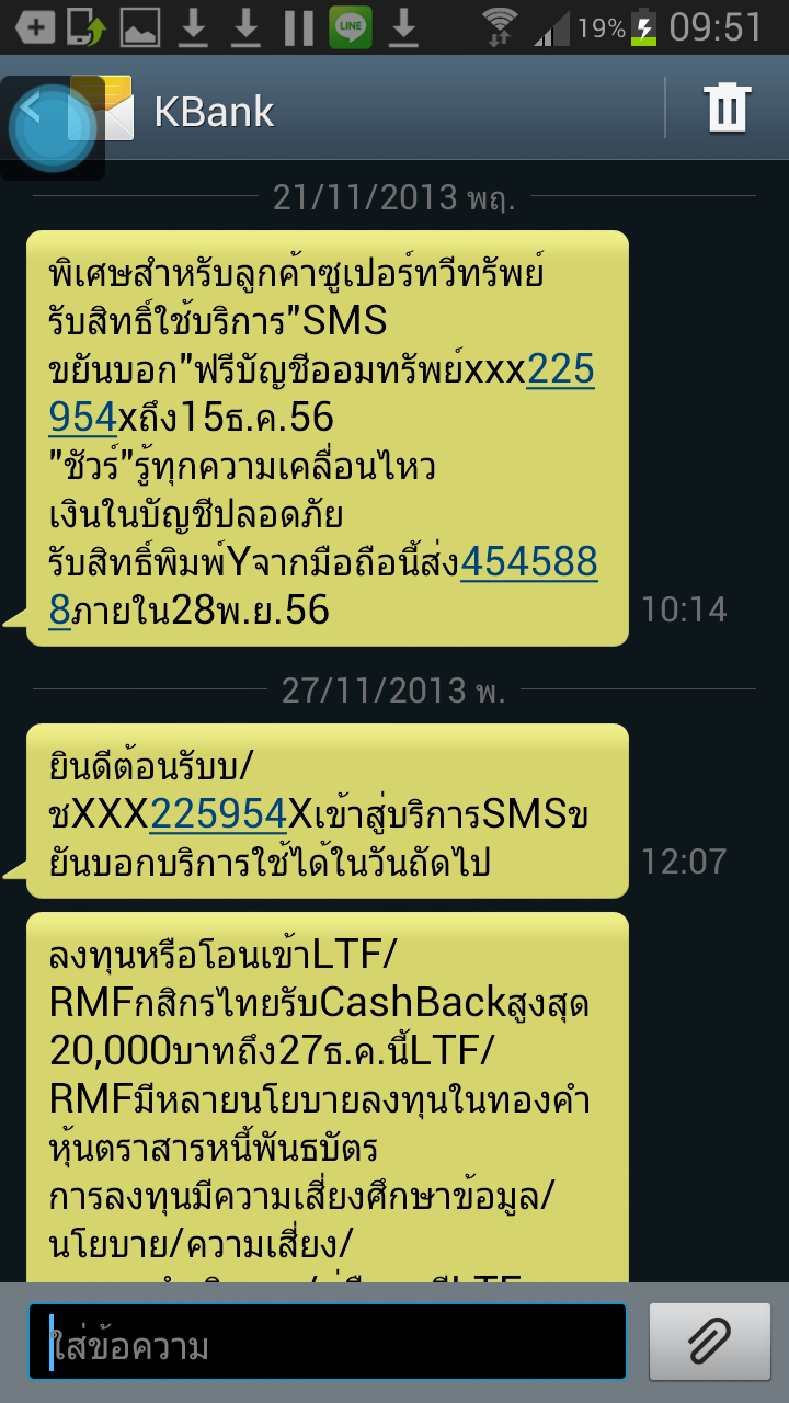 เริ่มจากมี SMS แจ้งว่าลูกค้าบัญชีซุปเปอร์ทวีทรัพย์อย่างผมได้สิทธิทดลองใช้บริการ SMS ขยันบอกฟรีตามภาพ ๑ ครับผมก็เลยตอบตกลงไปตามภาพ ๒