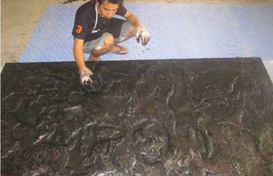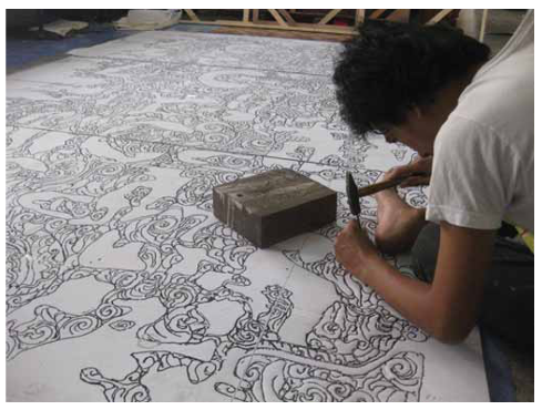 จากนั้นก็บุดุลโลหะ โดยทำการตอกกับพื้นเพราะจะได้เร็วขึ้นและได้ผลงานที่มีขนาดใหญ่ขึ้นต่างจากเทคนิคจากช่างโบราณที่ต้องใช้ชันในการรองแผ่นโลหะ