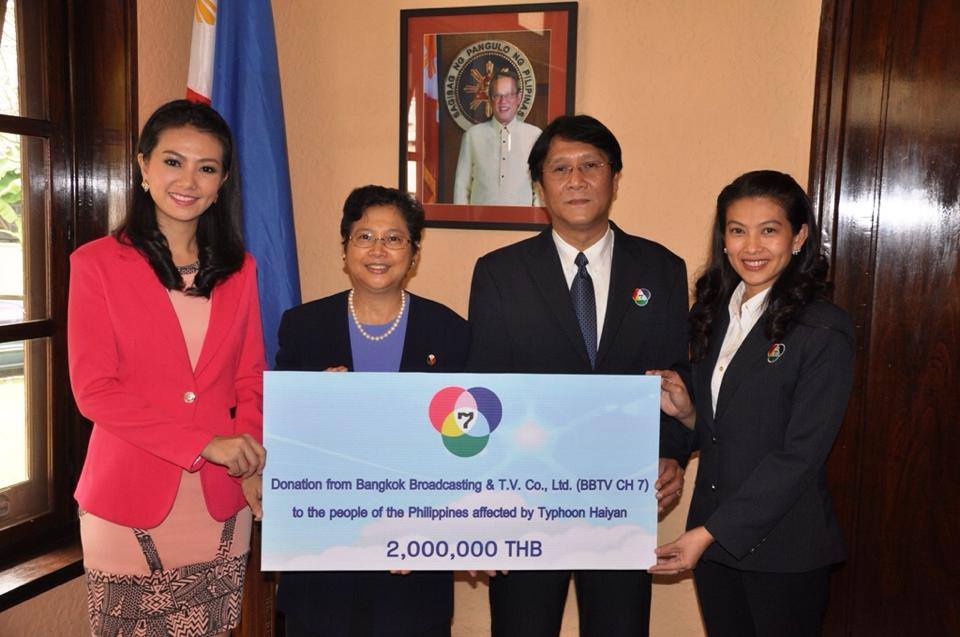 ++++จากสถานการณ์ล่าสุดที่ประเทศฟิลิปปินส์ พบผู้เสียชีวิตเพิ่มเติมจากเดิมเป็นจำนวนรวมกว่า 6,000 คน และมียอดผู้สูญหายอีกกว่า 1,700 คน ช่อง 7 สี จึงสนับสนุนเงินบริจาค จำนวน 2 ล้านบาท เพื่อช่วยเหลือและเยียวยาผู้ประสบภัยจากพายุไห่เยี่ยนที่อยู่ระหว่างการฟื้นฟูและได้รับความเดือดร้อนดังกล่าว ณ สถานเอกอัครราชทูตสาธารณรัฐฟิลิปปินส์ ประจำประเทศไทย