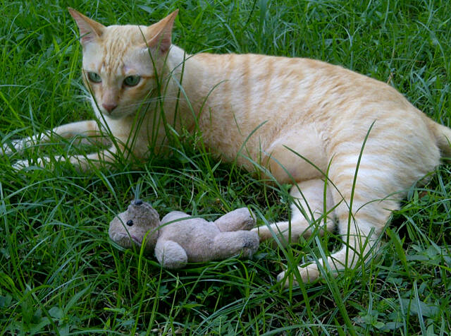 แมวถุงทอง เป็นแมวลายเสือสีเหลือง ตาสีเขียว ลายที่ตัวค่อนข้างชัดเจน