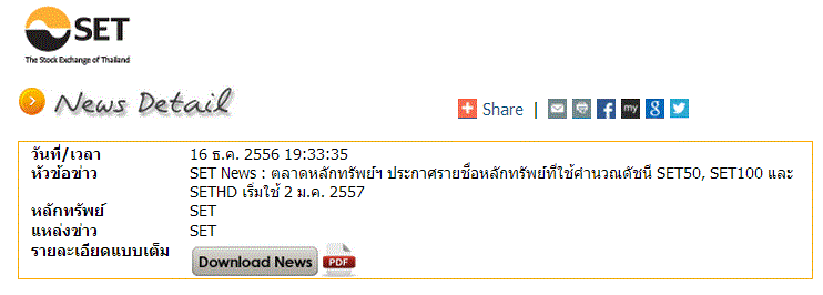 SET News : ตลาดหลักทรัพย์ฯ ประกาศรายชื่อหลักทรัพย์ที่ใช้คำนวณดัชนี SET50, SET100 และ SETHD เริ่มใช้ 2 ม.ค. 2557