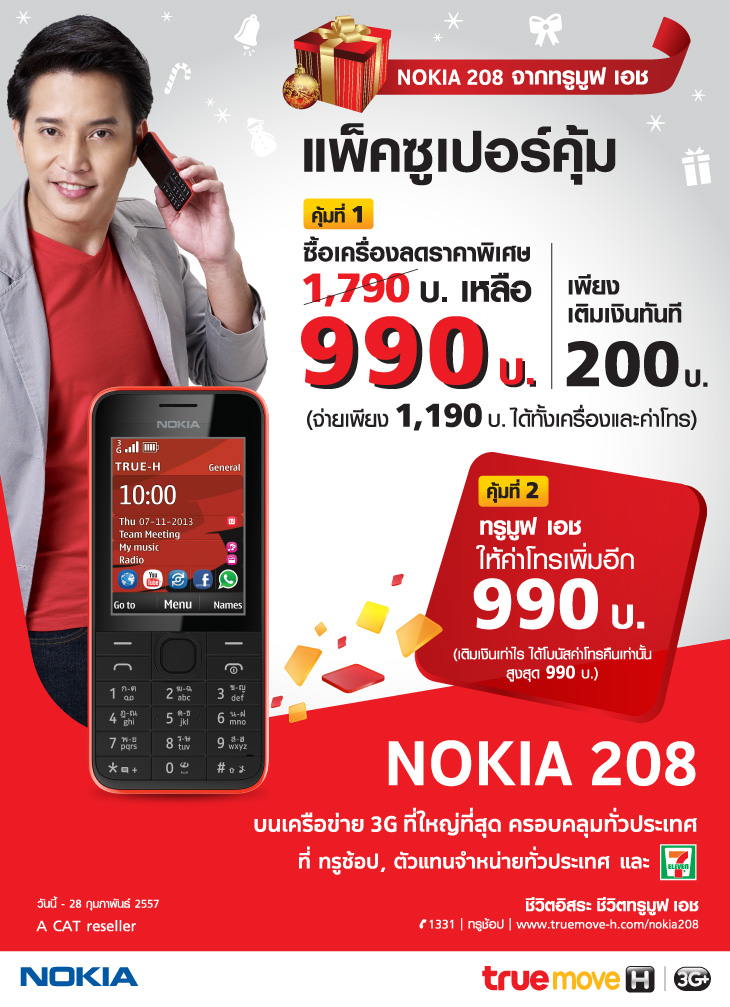 แพ็คซูเปอร์คุ้มฉลองปีใหม่ ซื้อทรูมูฟ เอช Nokia 208 จาก 1,790 บ. เหลือเพียง 990 บ. เพียงเติมเงินทันที 200 บ. และพิเศษยิ่งขึ้นรับค่าโทรฟรีสูงสุด 990 บ.