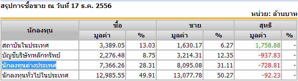 Sinthorn Summary 17/12/2556 : ต่างชาติขายสุทธิ -728.81 ลบ.