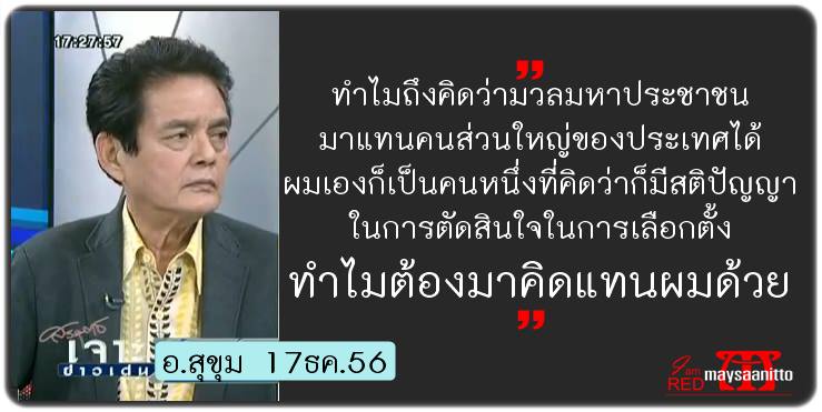 "ผมเองก็เป็นคนหนึ่งที่คิดว่าก็มีสติปัญญา ในการตัดสินใจในการเลือกตั้ง ทำไมต้องมาทำแทนผมด้วย..." ดร.สุขุม นวลสกุล