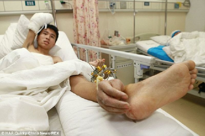โดยหนุ่มรายนี้ถูกนำตัวไปยังอีกโรงพยาบาลหนึ่งในเมืองฉางเต๋อ ขณะที่แพทย์ได้ปรึกษาหาทางที่จะช่วยกันต่อมือให้แก่หนุ่มเคราะห์ร้ายรายนี้ ก่อนที่จะตกลงกันว่าจะใช้วิธีนำแขนที่ขาดไปปลูกติดกับข้อเท้า เพื่อให้อวัยวะมือไม่ตาย โดยแพทย์ใช้เวลา 1 เดือน ก่อนจะนำมือที่ติดกับข้อเท้าออก และนำไปต่อกับแขนของเขา