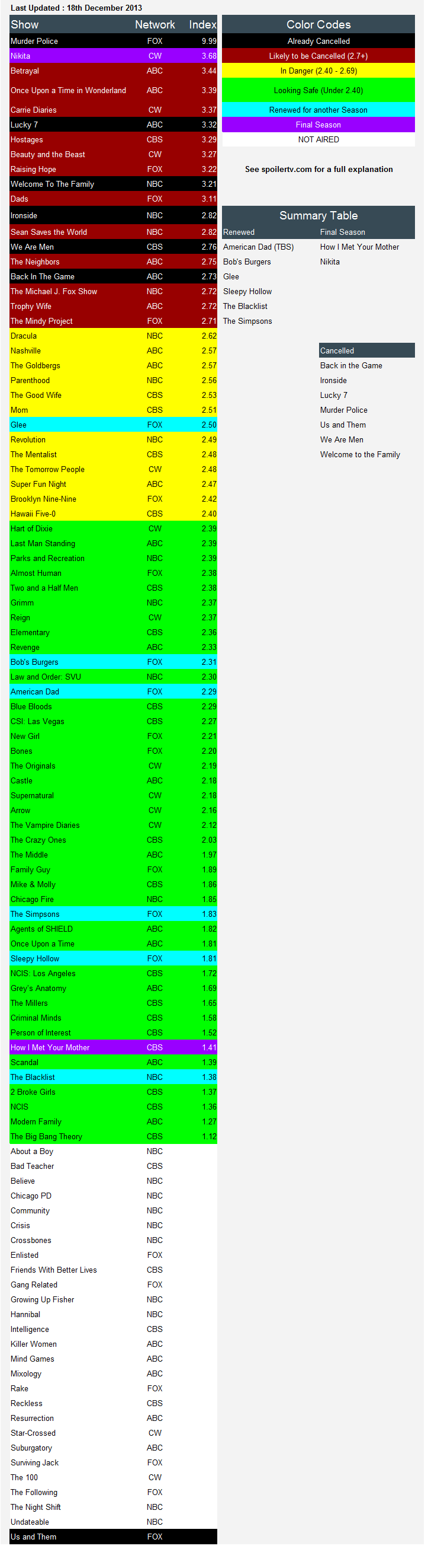 ข้อมูลจาก http://www.spoilertv.com/2013/09/spoilertv-cancellation-predictor-table.html