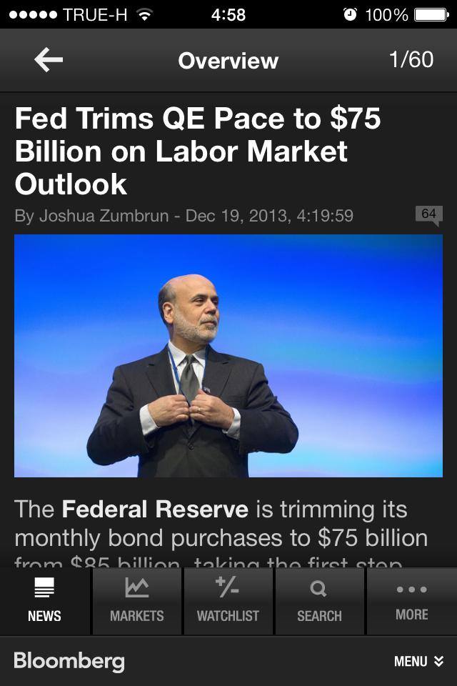ทั้งนี้ เบน เบอร์นันเก ประธานเฟดซึ่งกำลังจะหมดวาระในเดือน ม.ค. กล่าวในงานแถลงข่าวว่า หากข้อมูลเศรษฐกิจหลังจากนี้สนับสนุน การสนับสนุนการจ้างงานของคณะกรรมการนโยบาล เฟดก็อาจจะลดการซื้อพันธบัตรลงอีกในการประชุมในอนาคต อย่าไรก็ตาม เขาย้ำว่า ยังไม่มีความแน่นอนใดๆในเรื่องนี้ และทุกอย่างขึ้นอยู่กับข้อมูลที่ตามมา