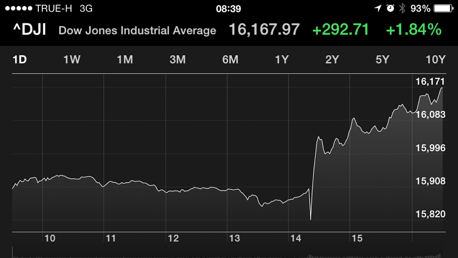 ดูกราฟ DOW JONES เมื่อวานนี้สิครับ พอประกาศออกมาปุ๊บ ทำท่าจะดิ่งลงจริงๆ ในตอนแรก