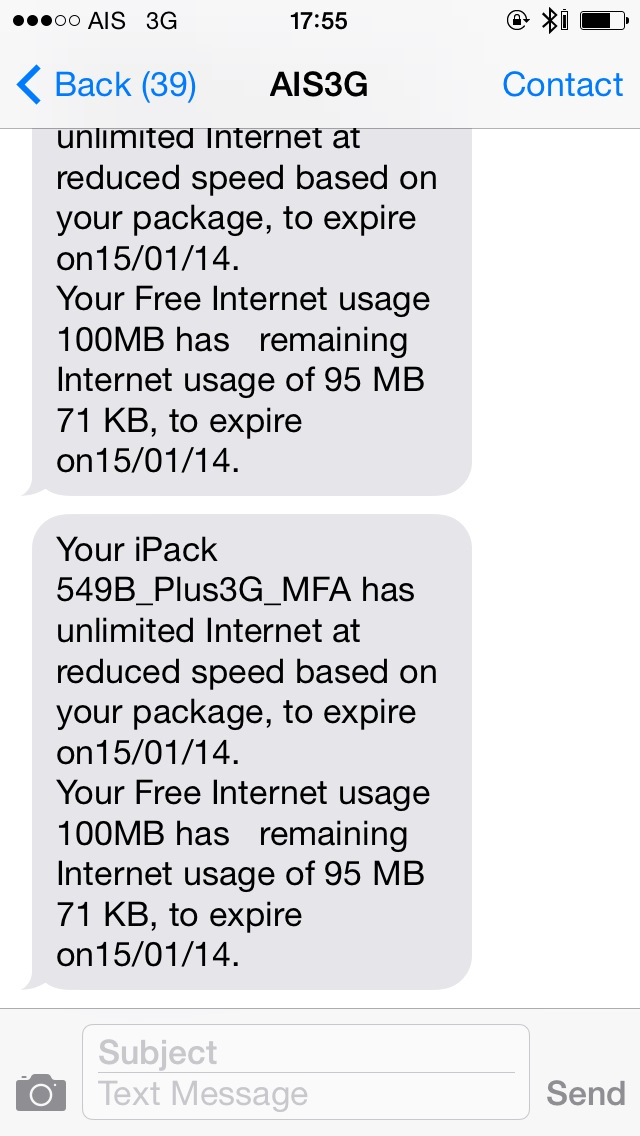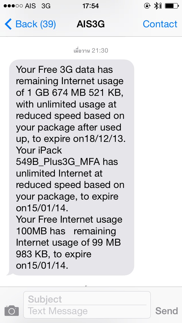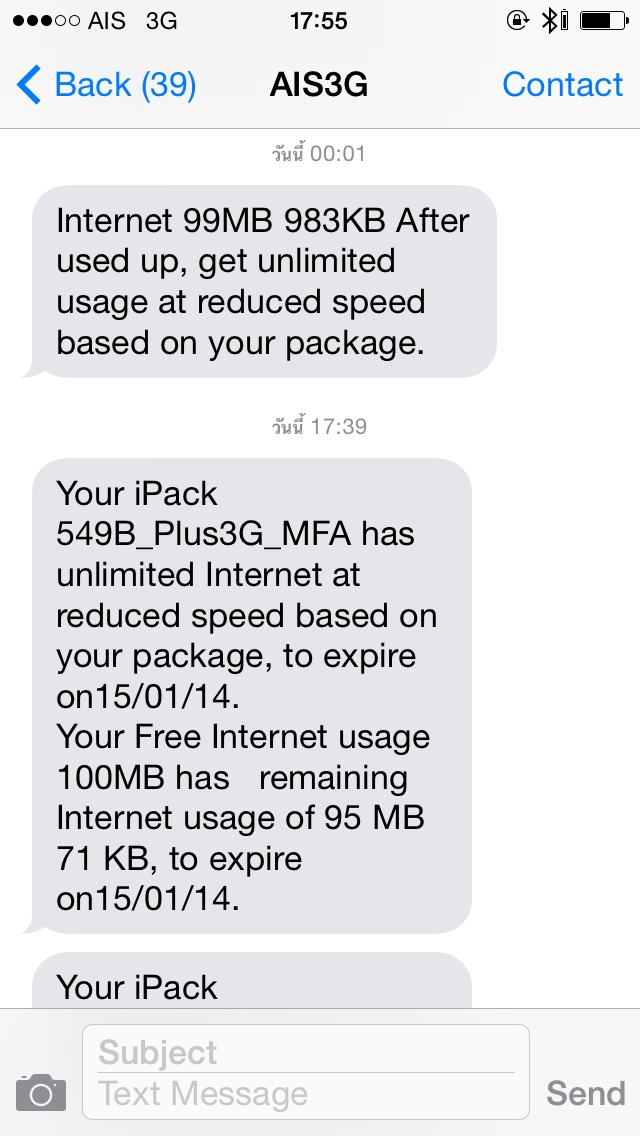 ในวันเดียวกันผมกับแฟนเราก็ออกไปเที่ยวกัน เค้าก็เลยดูหนังออนไลน์เพราะ AIS แจ้งมาว่าใช้เน็ท 3G "ไม่อั้น" แต่แล้วก็เกิดปัญหาขึ้นเมื่อโดนตัด Data Usage จากแพ็คเกจหลัก (21.30น.)