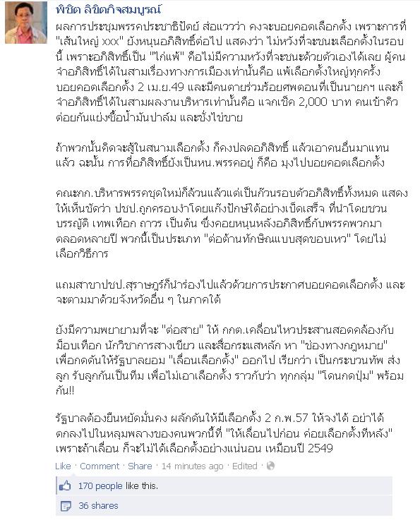 ถ้าพวกนั้นคิดจะสู้ในสนามเลือกตั้ง ก็คงปลดมาร์คเอาคนอื่นมาแทน ฉะนั้น รบ.ต้องยืนหยัดมั่นคง ผลักดันให้มีเลือกตั้ง 2 ก.พ.57