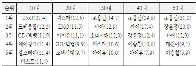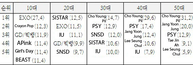 โดย EXO ได้รับความนิยมสูงสุดในช่วงอายุ 10ปีขึ้นไป ส่วน SISTAR ได้รับความนิยมสูงสุดในช่วงอายุ 20ปีขึ้นไป สุดท้าย Cho Young Pil ได้รับความนิยมสูงสุดในช่วงอายุ 30ปีขึ้นไป - 50ปีขึ้นไป