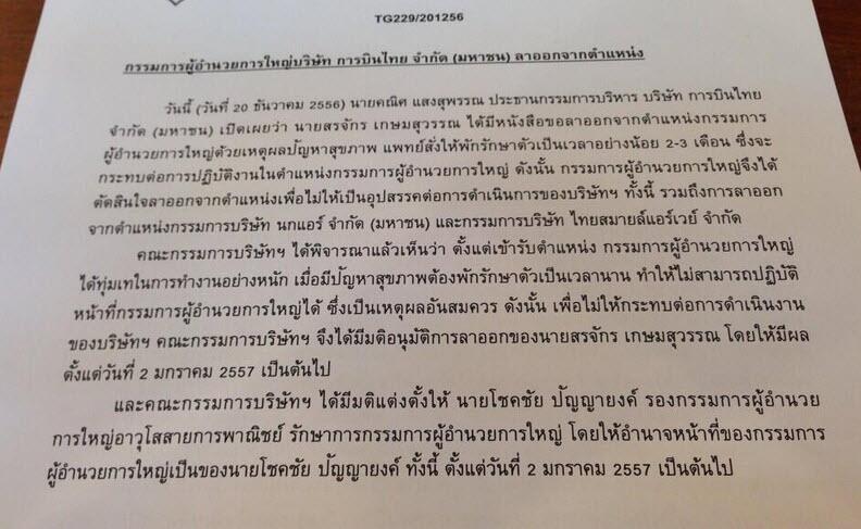 การบินไทยแถลงข่าว DD สรจักร ขอลาออก! มีผล 2 ม.ค.57 เหตุป่วยหนักต้องรักษาตัวไม่ต่ำกว่า 2-3เดือน
