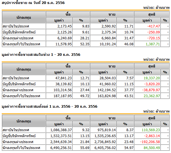 เว็บไซต์ตลาดหลักทรัพย์แห่งประเทศไทย รายงานสรุปการซื้อขายหลักทรัพย์ โดยแบ่ง ตามประเภทนักลงทุน ประจำวันที่ 26 ธันวาคม 2556 ดังนี้ กลุ่ม ปริมาณซื้อ % ปริมาณขาย % สุทธิ (ลบ.) (ลบ.) (ลบ.) นักลงทุนสถาบัน 4