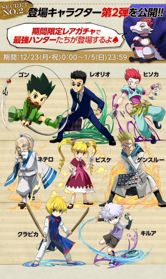 เนื่องในโอกาสที่ HunterXHunter ออกภาคMovie2 ในวันที่27ธันวานี้ ทาง Puzzle&Dragons จึงสร้างคาแรกเตอร์ชุดพิเศษ เป็น Gasha(สุ่มได้) ออกมาให้ผู้เล่นเกมส์และดูหนังได้ควานหาตัวละครHxHไปเล่นในเกมส์กัน