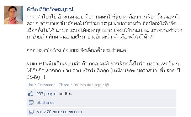 “กกต.บอกว่า 2 กุมภาพันธ์ 57 อาจเลื่อนวันเลือกตั้งได้ เลื่อนนั้นไม่ใช่แค่ 2-3 เดือน แต่ต้องใช้เวลาเลื่อน 1-2 ปี รัฐบาลจะอ้างเป็นคนนำการปฏิรูป เพราะอาจเขียนกฎหมายให้ตัวเอง แบบนี้ไม่ได้ ต้องมอบให้ป