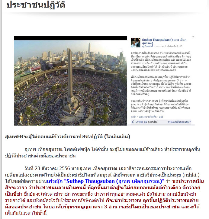ไม่ต้องให้ยิ่งลักษณ์ลาออ ครมลาออก แล้ว คุณได้อำนาจไป หมดแล้วตั้งแต่เมื่อวาน ไม่ต้องมาถอยอีกนิด อะไรแล้ว เดินหน้าปฎิรูป ปฎิวัติอะไรก็เอามาเลย คนเค้ารอดูอยู่ ได้ เอาร่างรัฐนูญออกมาเลย เข้าเฝ้าเลย อย่าใ