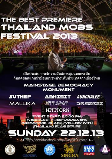 ได้แก่ นายสุเทพ เทือกสุบรรณ,นายอภิสิทธิ์ เวชชาชีวะ,น.ส.มัลลิการ บุญมีตระกูล,น.ส.จิตตภัสร์ ภิรมย์ภักดี,ดร.เสรี วงษ์มณฑา พร้อมทั้งโลโก้ผู้สนับสนุนอีกมากมาย สถานที่จัดงาน Main Stage : Democracy Monument โดยมีเครื่องดื่มและอาหารฟรีตลอดงาน
