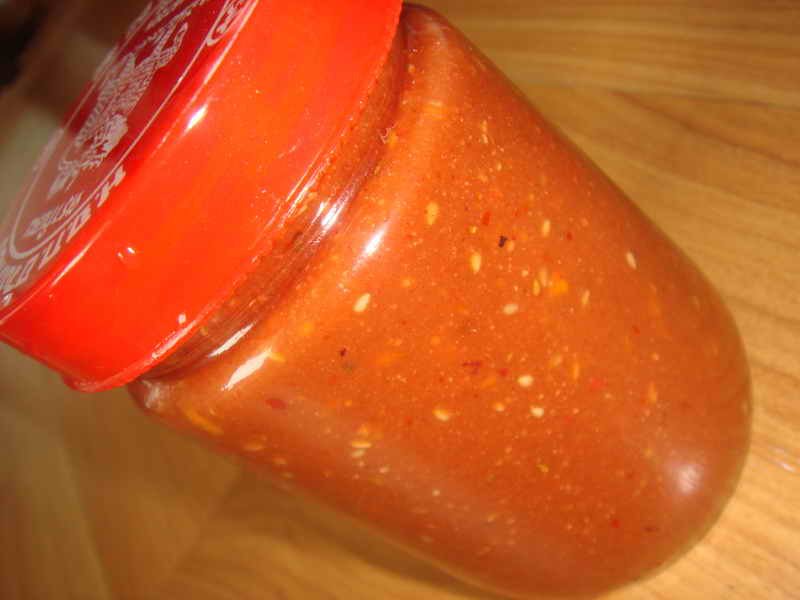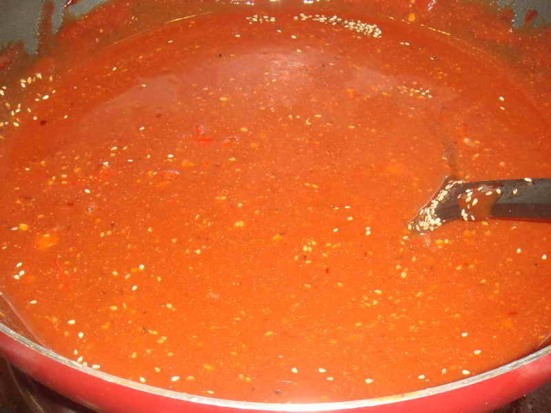 จากนั้นเราก็เอาพริกแดงและกระเทียมมาบดหรือโขลกให้ละเอียด แล้วนำไปเคี่ยวด้วยกัน พอได้ที่แล้วก็เอางาขาวที่เราคั่วไว้แล้ว นำมาผสมคนให้เข้ากัน