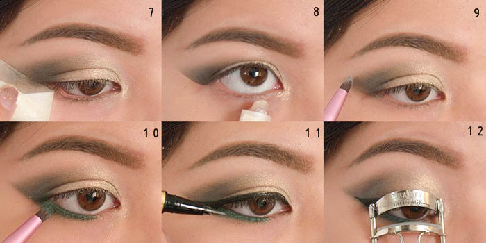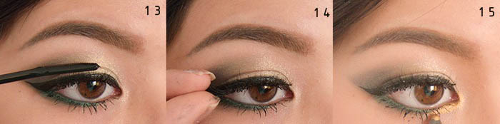 4.ใช้สี เขียวขี้ม้าตุ่นๆ จากเมเบอลีนตัวเดิม (หมายเลข3)ลงช่วง หางตาเกลี่ยให้ฟุ้งออกไปข้างๆ ตา