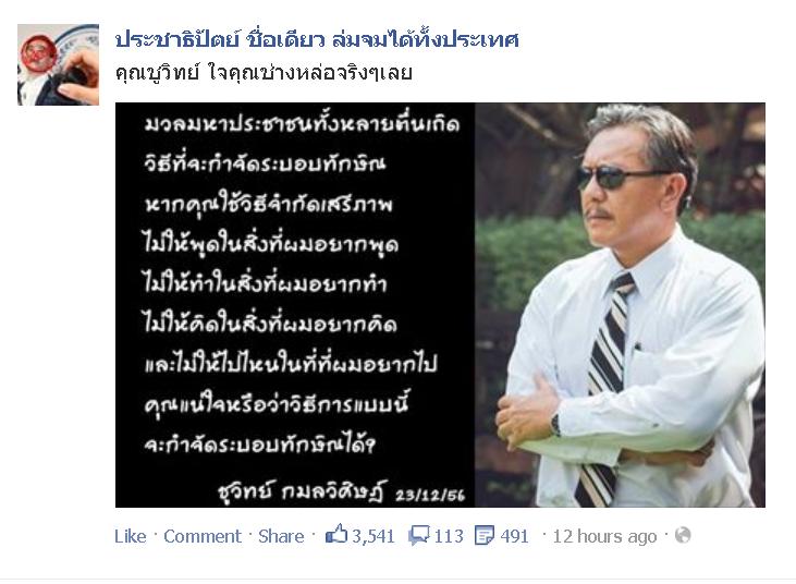 ชูวิทย์ กมลวิศิษฎ์ อดีตหัวหน้าพรรครักประเทศไทย โพสต์ข้อความผ่านเฟซบุ๊ก ถึงกรณีที่ม็อบ กปปส. ปิดล้อมสนามกีฬา ไทย-ญี่ปุ่น ดินแดง โดยระบุว่า เป็นการรุกล้ำสิทธิ์ของผู้อื่นและละเมิดกฎหมาย ซึ่งขัดแย้งกับการ