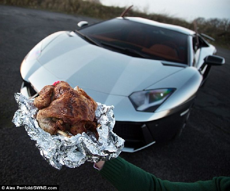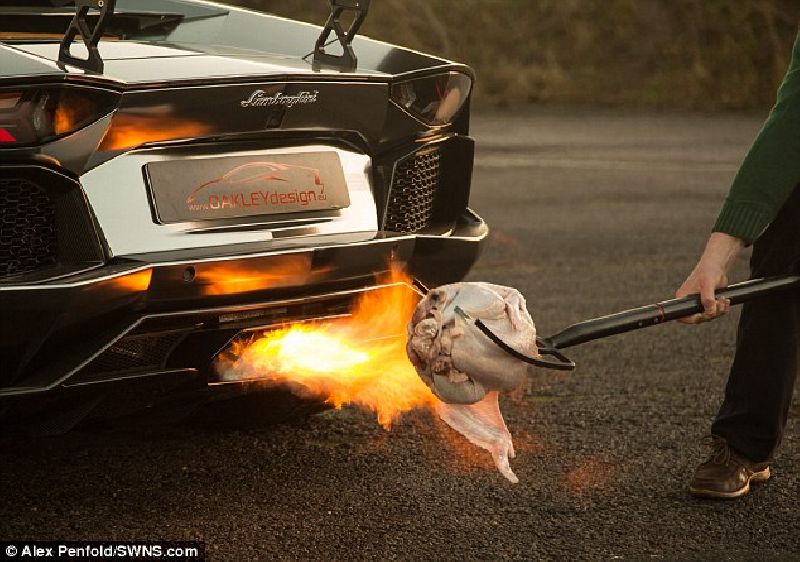 รายงานระบุว่า นายทิม เบอร์ตัน ชาวอังกฤษ ซึ่งปิ๋งไอเดียว่า รถซุปเปอร์คาร์จะสามารถย่างไก่งวงด้วยไฟจากการเร่งความเร็วได้หรือไม่ ได้ขอให้เจ้าของรถยนต์หรูลัมโบร์อกีนีรุ่น "AVentador" ใช้ความเร็วของรถยนต์ย่างไก่ให้สุก ด้วยไฟจากท่อรถยนต์ที่เร่งความเร็วเกือบสุดขีด ซึ่งปรากฏว่า ท่อเครื่องยนต์ได้ลุกเป็นไฟทุกครั้ง จนสามารถย่างไก่ดังกล่าวสุกภายในเวลา 10 นาที ในสภาพร้อนสุดขีด