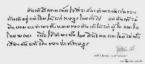 "ข้าพเจ้ามีความเต็มใจที่จะสละอำนาจอันเป็นของข้าพเจ้าอยู่แต่เดิมให้แก่ราษฎรโดยทั่วไป แต่ข้าพเจ้าไม่ยินยอมยกอำนาจทั้งหลายของข้าพเจ้าให้แก่ผู้ใด คณะใดโดยเฉพาะเพื่อใช้อำนาจนั้นโดยสิทธิขาด และโดยไม่ฟังเสียงอันแท้จริงของประชาราษฎร"