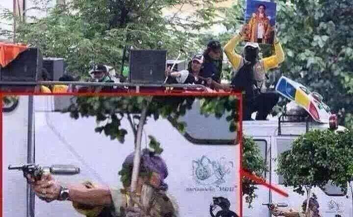 เป็นภาพเก่าของมือปืนในม็อบ พธม. ชัดเจนและปฏิเสธไม่ได้ ตามภาพข้างล่าง และก็ยังไม่มีข่าวใดๆว่าได้ดำเนินคดีกับคนในภาพ เพราะฉะนั้นมันต้องอยู่ในม็อบ กปปส. อย่างแน่นอนที่สุดเพราะมีแนวทางเดียวกันคือล้มรัฐบาลที่มาจากการเลือกตตั้ง แล้วทำไมจะใช้ภาพของมันอีกไม่ได้
