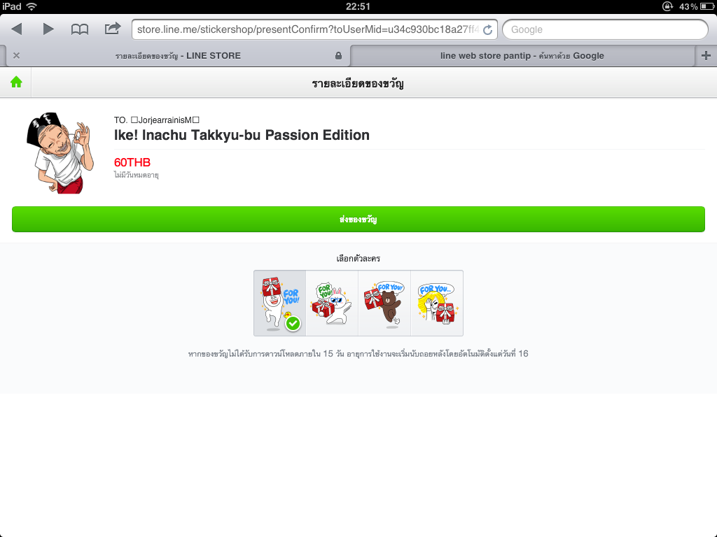 ตามรูปเลยครับ ผมซื้อสิต๊กเกอร์ตัวนี้ แล้วจะส่งให้เพื่อน กดส่งของขวัญแล้วมัน เด้งมาให้เลือกจ่ายเงิน คือมันต้องเสียเงินอีกเหรอครับ ผมเข้าใจว่าส่งให้เพื่อนได้ฟรี ใครรู้ช่วยแนะนำที ขอบคุณล่วงหน้าครับ