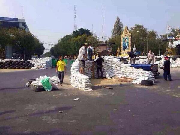 ภาพนี้ถ่ายที่ถนนราชดำเนินนอกเมื่อบ่ายนี้ น่าจะแถว ๆ หน้า พล.1 ผมสงสัยว่าเขากำลังตั้งบังเกอร์เพื่อทำอะไรกัน เอาไว้ซุ่มยิงหนังสติ๊กหรือครับ