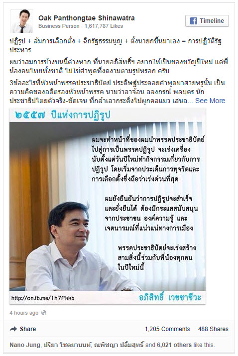 นายพานทองแท้ ชินวัตร บุตรชายอดีตนายกฯ ทักษิณ ชินวัตร โพสต์เฟซบุ๊ก Oak Panthongtae Shinawatra แนะ "อภิสิทธิ์" ปฏิรูปพรรคฯตัวเอง ปฏิรูปความมีน้ำใจนักกีฬา รู้แพ้-รู้ชนะ-รู้อภัย ปฏิรูปนิสัยตัวเองให้ดีเสียก่อน จึงค่อยมาเสนอหน้าเป็นผู้ปฏิรูปประเทศไทยครับระบุว่า ปฏิรูป + ล้มการเลือกตั้ง + ฉีกรัฐธรรมนูญ + ตั้งนายกขึ้นมาเอง = การปฏิวัติรัฐประหาร