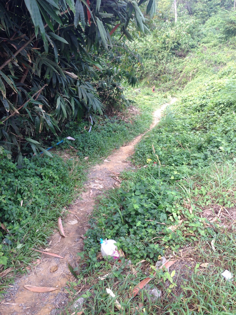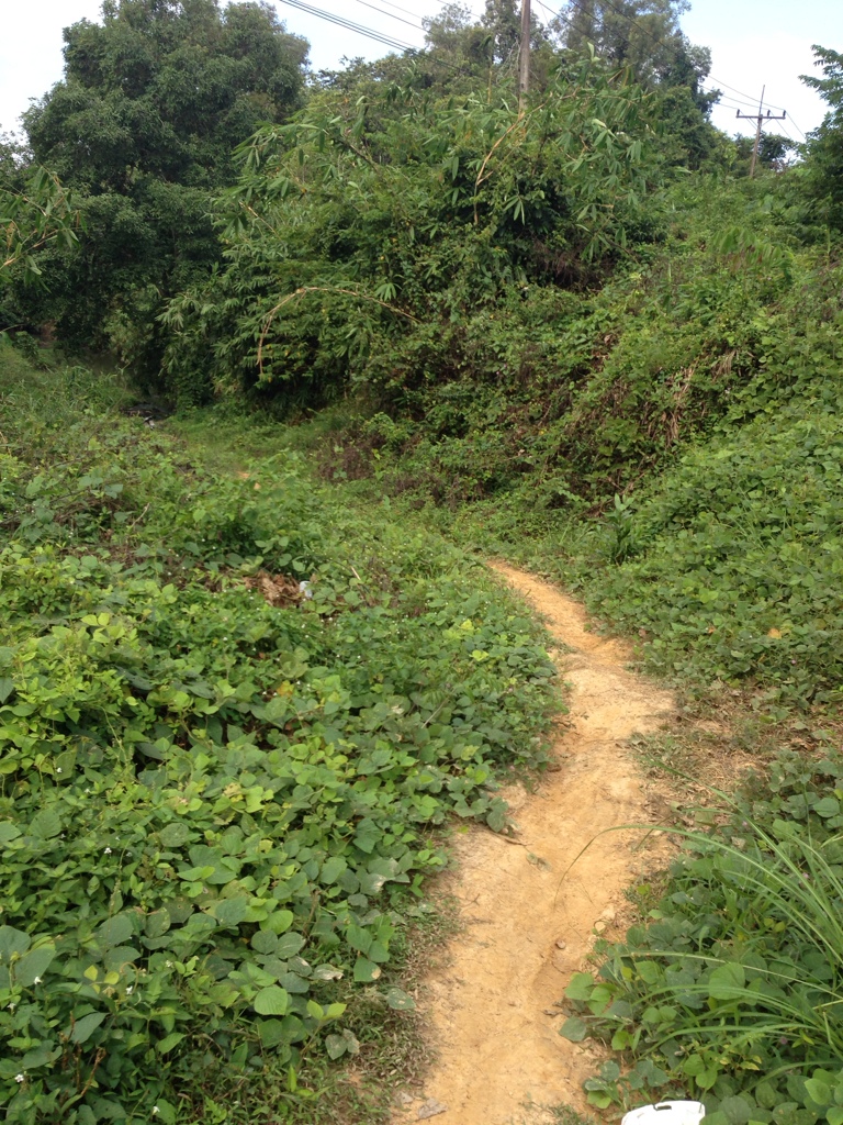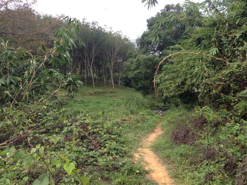 หนทางข้างหน้าเป็นทางลงไปยังลำธาร ข้างหน้ามีสวนยาง บรรยากาศดีสุดๆ