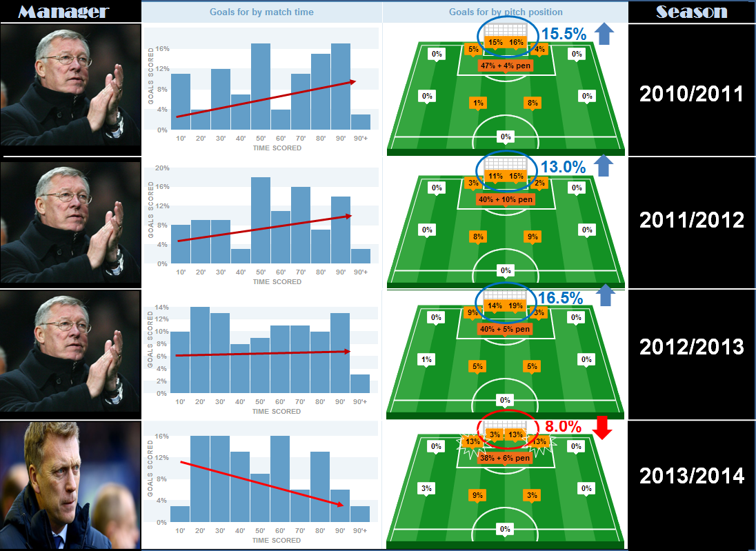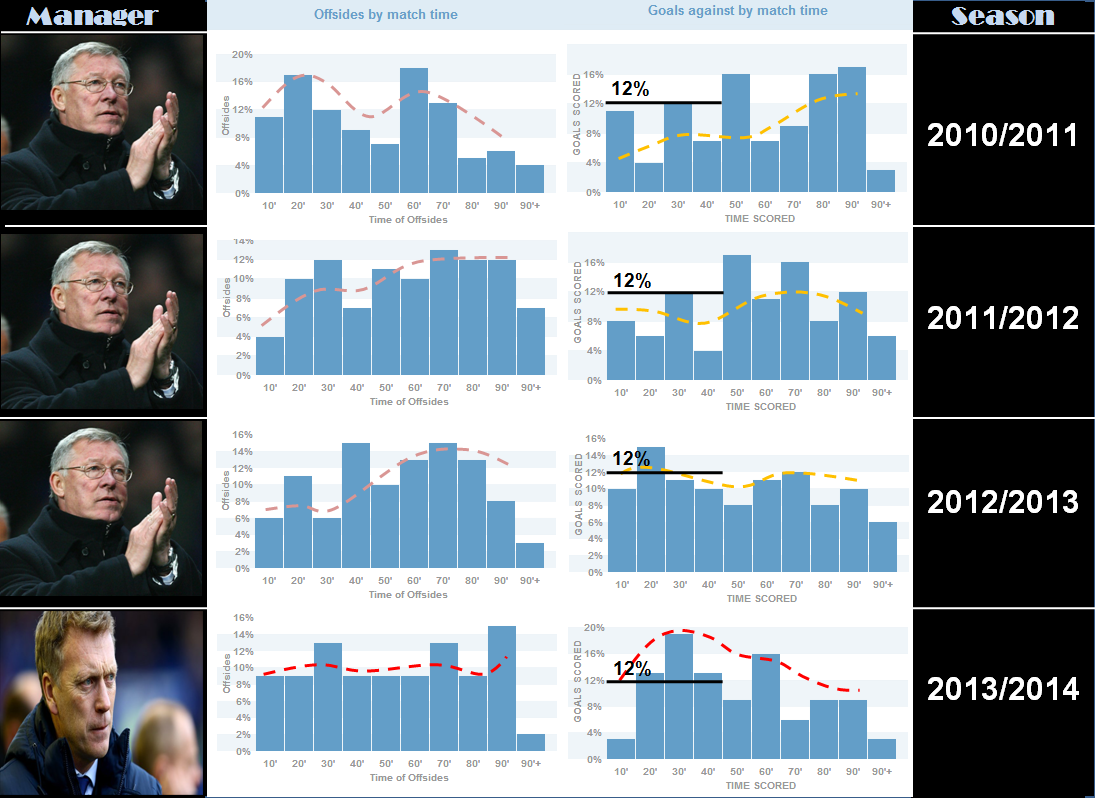(5) แผงหลังไม่นิ่ง : สิ่งหนึ่งที่เห็นได้ชัดคือทีมของมอยส์มักจะเสียสมาธิ และเสียประตูค่อนข้างเยอะ ในทุกๆช่วงไทม์เรนจ์ของครึ่งแรก >12% ขณะที่ทีมของเฟอร์กี้ ค่อนข้างจดจ่อกับเกมส์ได้ดีตลอดทั้งเกมส์ บ่งบอกว่าแผงหลังของมอยส์ยังนิ่งไม่พอ