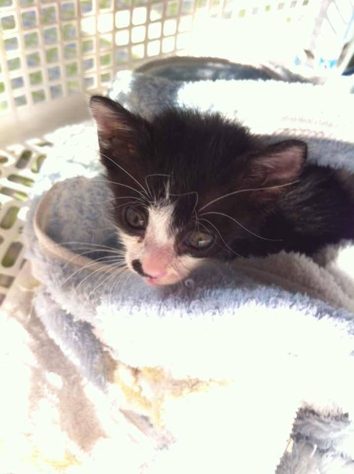 มีคนเจอลูกแมววิ่งไล่กันอยู่ ถามรปภบอกว่าเก็บเจ้าตัวเล็กขึ้นมาจากท่อ อีกตัวไม่รู้ เด็กๆถูกย้ายมาบ้านพักชั่วคราว เจ้าตัวเปรอะโดนกัดมาขาเจ็บเดินสามขามีหนองไหลออกจากสะโพกด้วย ตอนนี้แผลหายดีแล้ว เจ้าตัว