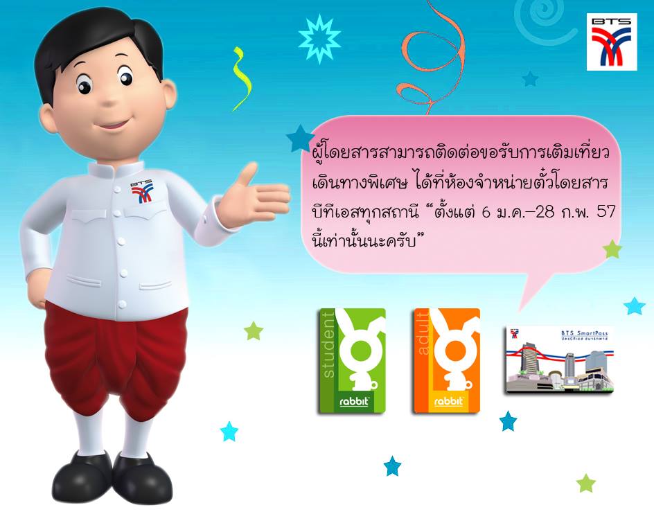 ผู้โดยสารสามารถติดต่อขอรับการเติมเที่ยวเดินทางพิเศษได้ที่ห้องจำหน่ายตั๋วโดยสารบีทีเอสทุกสถานี ตั้งแต่วันที่ 6 มกราคม ถึง 28 ***มภาพันธ์ 2557 เท่านั้น