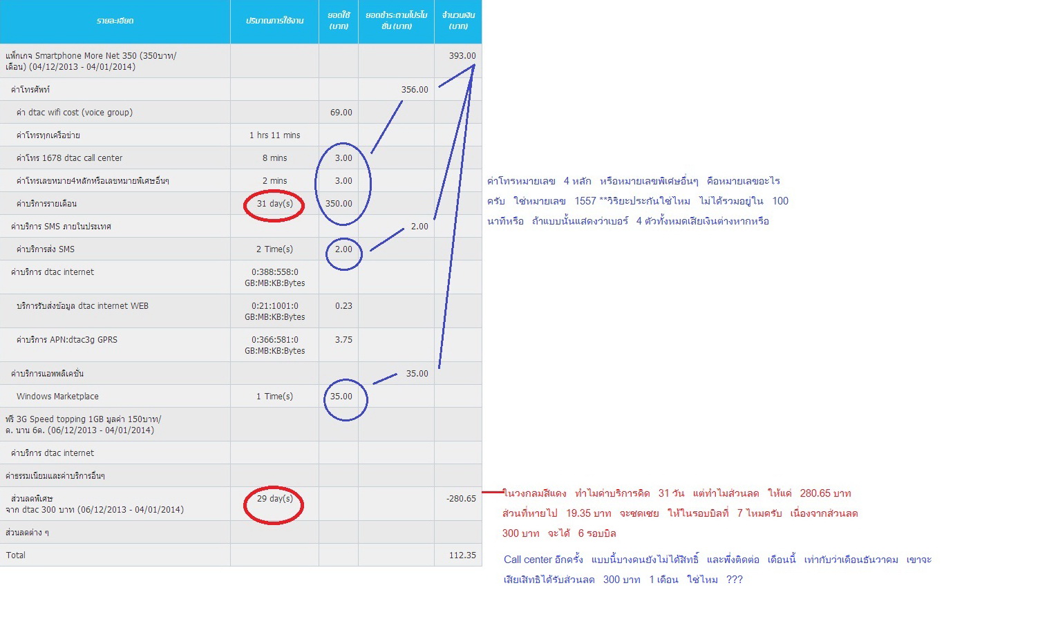 2. ทำไมส่วนลดได้แค่ 280.65 บาท ส่วนที่หายไป 19.35 ไม่ทราบว่าจะชดเชยให้ในรอบบิลที่ 7ไหม ถ้าคำตอบคือไม่ มีผุ้ใช้บริการบางคนเข้าใจว่า ย้ายค่ายเสร็จ ซื้อเครื่องใช้สิทธิส่วนลด 4000 แล้ว น่าจะได้ ส่วนลด 300 บาท และอินเตอร์เนท เพิ่ม 1 GB 6 เดือนอัฒโนมัติ แต่ที่จริง ต้องติดต่อ Call center อีกครั้งเพื่อลงทะเบียน บาคนไม่รุ้ และพึ่งติดต่อเดือนนี้ จะเสียสิทธิ์ ที่สมควรได้ส่วนลด 300 บาทและอินเตอร์เนท 1 GB ในเดือนธันวาคมไปเลยหรือครับ