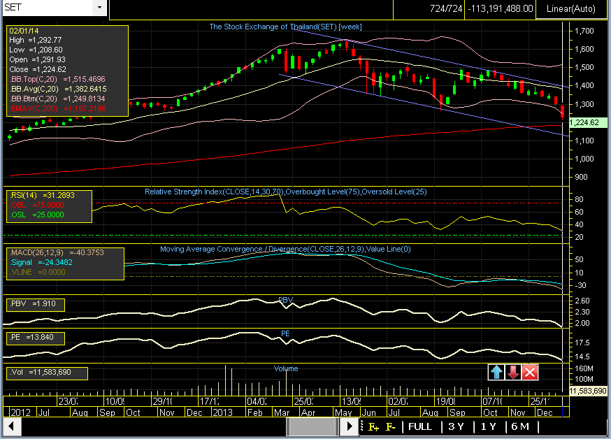 อัพเดทสุดสัปดาห์ จากภาพระยะยาว จะเห็นว่าระลอกคลื่นของ SET ได้สร้างกรอบคู่ขนานขึ้นมาซึ่งแปลความได้ว่าในขาลงรอบนี้จะมีแนวรับที่แข็งแกร่งอยู่เหนือ 1100 จุด นั่นหมายความว่า แม้ว่าในเลวร้ายสุด (Worse Case) แนวรับระยะยาวขนาดใหญ่แถว 1180 จุด(EMA200) จะเอาไม่อยู่ ก็ไม่ได้หมายความว่าจะต้องล้างพอร์ตหนีจากตลาดออกไปเลยแบบสมัยต้มยำกุ้งหรือ แฮมเบอร์เกอร์ ในปี 51 นั้น เมื่อ SET หลุด 725 จุด ก็จะหลุดกรอบ Side Way ไปด้วย อีกทั้งเป็นการลงจากผลกระทบโดยตรงของเศรษฐกิจ แต่ปัญหาการเมืองนั้นเป็นเพียงผลกระทบทางอ้อมและอยู่ในวงจำกัด ดังนั้นไม่น่าตื่นตะหนกจนเกินเหตุ การลงมาในรอบนี้หากหลุด 1200 จุด ก็ควรมองทางซื้อไม่ใช่ทางขาย แต่แน่นอนว่ามือใหม่ขาดประสบการณ์ย่อมมีโอกาสแบกรับความกดดันในตลาดขาลงได้ยาก เมื่อเห็นพอร์ตตัวเองต้องเสียหายต่อเนื่องทุกวัน จนเกินลิมิตของตัวเองก็อยากขายหนีออกไปดูสถานการณ์ก่อน แต่ส่วนใหญ่จะไม่กล้ารับ หรือรับก็รีบขายไวเกินไป ทำให้รอบการเล่นยิ่งเสียหายเมื่อ SET เด้งขึ้นอย่างเร็วและแรงทั้งที่พึ่งขายไป โดยส่วนตัวคิดว่าหากไม่แน่ใจก็ทยอยแรับและทยอยขายดีกว่า เพื่อให้ตัวเองยังอยู่ในเกมส์ได้ตลอด สุดท้ายนี้ขอให้โชคดีและร่ำรวยทุกท่านตลอดปีใหม่ครับ