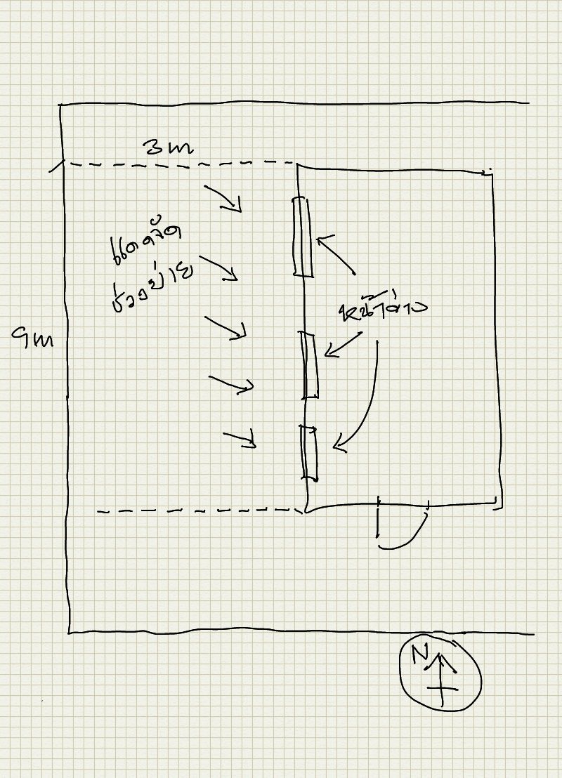บ้านหันหน้าไปทิศเหนือ ด้านทิศตะวันออกติดบ้านข้างเคียงจึงทำเป้นครัวและที่จอดรถ ด้านทิศตะวันตกเป็นพื้นที่โล่งติดกับบ้านเดิม ประมาณ 40*14 เมตร (เป็นที่ของเรากับพี่ชาย) ผมแบ่งพื้นที่ด้านข้างบ้าน ด้านทิศตะ
