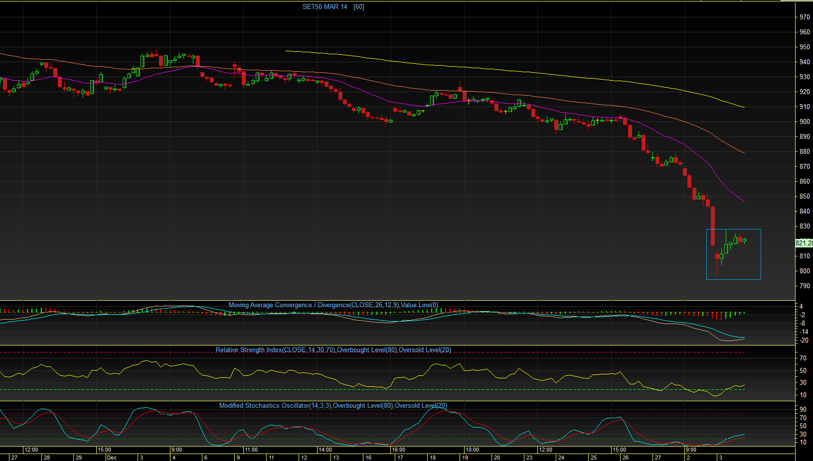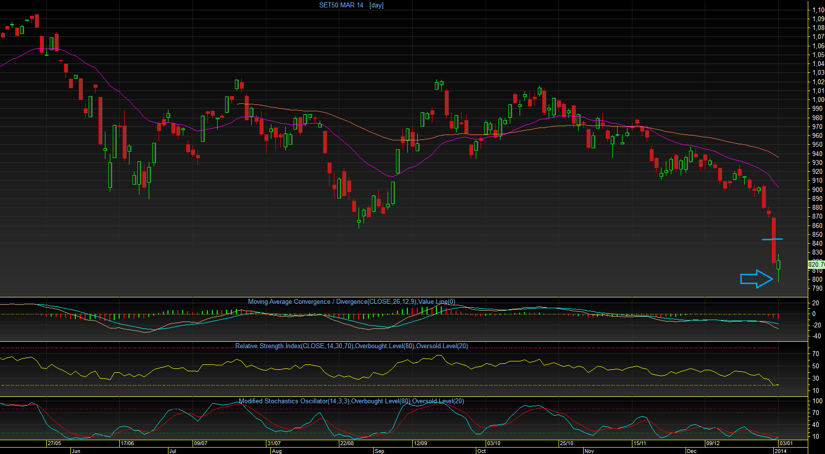 แล้วมีแรงซื้อเข้ามาพยุงและดันขึ้นไปได้ และปิดแท่งไปแบบ "Morning Star" บวกกับ สัญญาณทางเทคนิคที่เข้าสู่ภาวะ Oversold