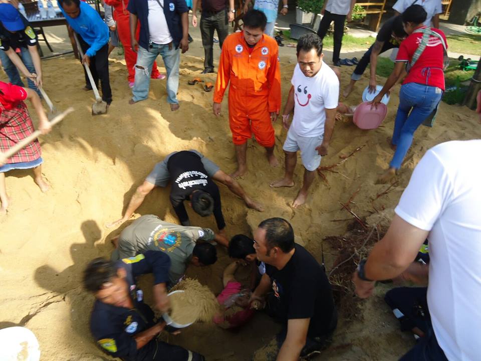 นาย เอกรัตน์ ชูทอง อาสาสมัคร กู้ชีพกู้ภัยเขาหลัก กล่าว เมื่อมาถึงที่เกิดเหตุพบ ร่างหญิงสูงอายุ จมอยู่ในทรายกำลังจะท่วมปากโดยมีชายร่างใหญ่จับมือเพื่อไม่ให้ทรายดูดลงไปอีก จากนั้นจึงได้เร่งขุดทรายที่ทับร่างหญิงสูงอายุออกและได้