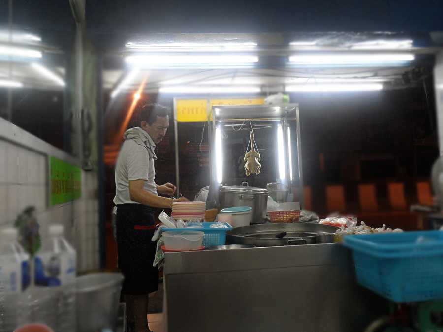 ร้านที่ตู้ทางซ้ายห้อยไก่ต้ม และหม้อทางขวาตุ๋นขาหมู นี่คือโอกาสพิเศษ ผมสั่งข้าวขาหมู แต่ให้โปะขาหมูไว้บนข้าวที่หุงด้วยมันไก่ รสชาติมันหมูกับมันไก่โอบรัดกันลึกซึ้งเข้าเส้นเลือด ข้าวหุงมันไก่จนหอม