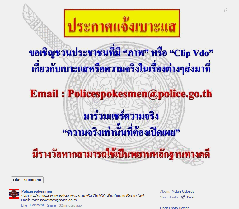 ประกาศแจ้งเบาะแส เชิญชวนประชาชนส่งภาพ หรือ Clip VDO เกี่ยวกับความจริงต่างๆ ได้ที่ Email: Policespokesmen@police.go.th